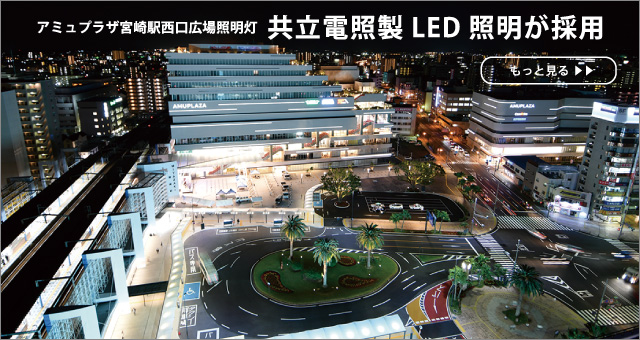 宮崎の玄関口JR宮崎駅西口前の複合施設アミュプラザ宮崎広場のLED照明灯は、共立電照社製が採用されました。