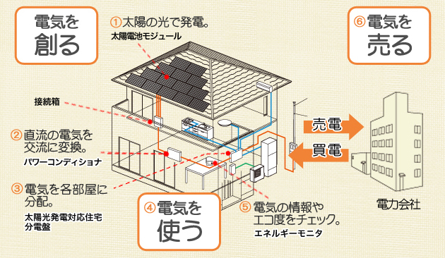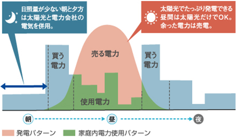 使った電気の量より、太陽光発電で創った電気の量のほうが多くて余ったら。その余った電気は自動的に電力会社に買い取ってもらえ、とってもおトク。これを「売電」といいます。