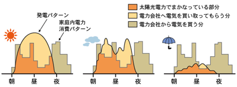 雨の日でも(その時の)明るさに応じて発電しますが、電力会社から電気を買う量が多くなります。