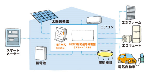 家庭で使うエネルギーを節約するための管理システムです。家電や電気設備とつないで、電気やガスなどの使用量をモニター画面などで見える化したり、家電機器を自動制御したりします。