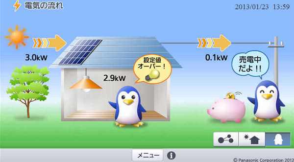 また、家全体の電力使用量が、あらかじめ設定した日割り目標値を超えると、LED調光スイッチに接続した照明を自動減光し自動的に節電制御します。