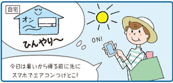 スマートフォンでエアコンの操作ができるので、「エアコンのスイッチ、消し忘れたかも…」という時でも、外出先からエアコンの状況を確認して、スイッチを切ることができます。また、帰宅前にエアコンのスイッチを入れて、あらかじめ冷暖房しておくことも可能です。 さらに、エコキュートの操作もできるので、帰ったらすぐにお風呂に入れるように、帰宅前にお湯張りをスタートさせることも可能です。