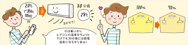 エアコンの運転を開始(冷房または暖房)してから30分後に省エネ温度(冷房28℃、暖房20℃)に自動で変更してくれます。帰宅時や早朝などつい設定温度を上げ・下げして適正温度に戻し忘れるのを防止できます。