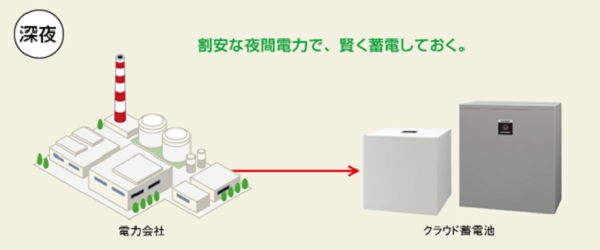 天気予報に合わせて、蓄電池の放電を自動制御します。例えば、朝の天気予報で雨が予想されている日なら、夜間に充電した割安な電気を、料金が割高な昼間に放電するようにクラウド蓄電池を自動制御します。太陽光発電では足りない電気を、クラウド蓄電池にためた電気で賢く補えます。