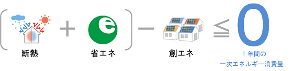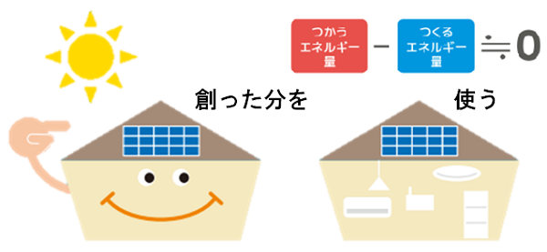 家庭での年間エネルギー消費量をおおむねゼロにする住宅のこと。具体的には、建物の断熱性を高めエアコンの使用量を減らし、高効率な給湯機やHEMSを活用して、消費するエネルギーを減らします。その分を太陽光発電、燃料電池などでつくった電気を使うことでトータルゼロにします。