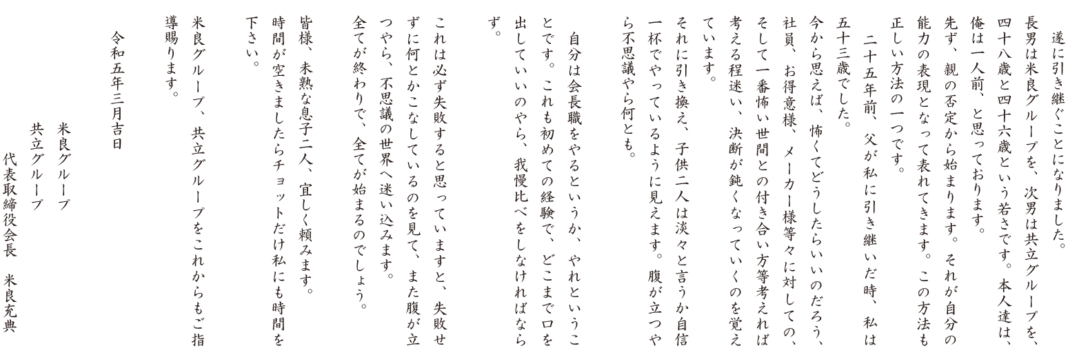 創業1952年。祖父、そして父が72年間つないできたバトンを受け継ぎ、2023年4月、代表取締役社長に就任いたしました。その歴史と使命の重さに、非常に大きな責務をひしひしと感じながら、社是「育人・敬客・愛品」を守り、厳しく自己を律しつつ着実に進んでいく覚悟です。