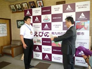 写真は村岡市長に目録を手渡す米良社長です。