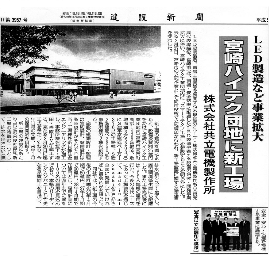 3月1日付け地元の建設新聞に(株)共立電機」製作所の企業立地調印式及び進出計画の概要が掲載されました。