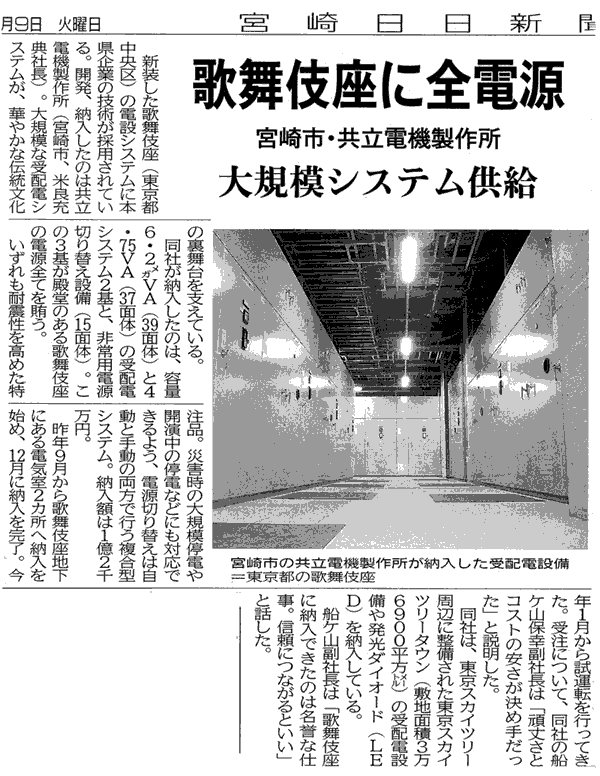 [共立電機製作所]4月9日(火)宮崎日日新聞9面に歌舞伎座(東京)への納品事例の紹介記事が掲載されました。