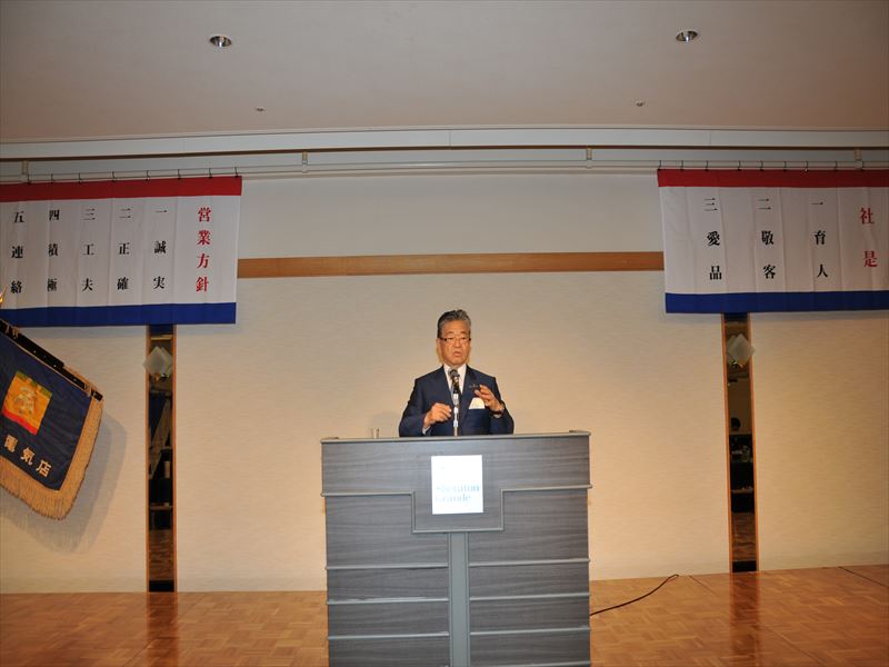 同会の冒頭、弊社会長の米良充典が「宮崎県内のみならず、日本国内、また、国外も視野に入れて、今期も事業展開をしていきたい。では、そのためには、何を目的に、どう行動をしていくのか?を常に考えています。そのような気持ちを大切に全社員一丸となって今後も邁進していきます。自分の会社の特長、ユニークさをどう表現すればいいのか?どこをターゲットにしていくのか?を常に考え、会社の社会性をどう創造していくのか?そう考えていく企業は力が強いと考えています。また、人口減少に伴う人で不足に対応していくため、企業の大中小ではなく、インターンシップの積極的な導入など、学生が今後社会へ進む前に、企業人として育成を図っていってもらいたい」と挨拶いたしました。