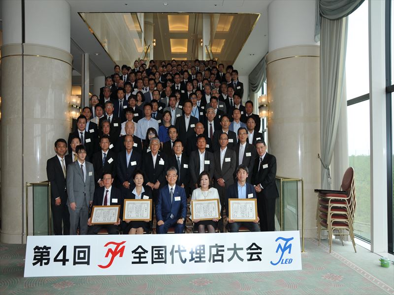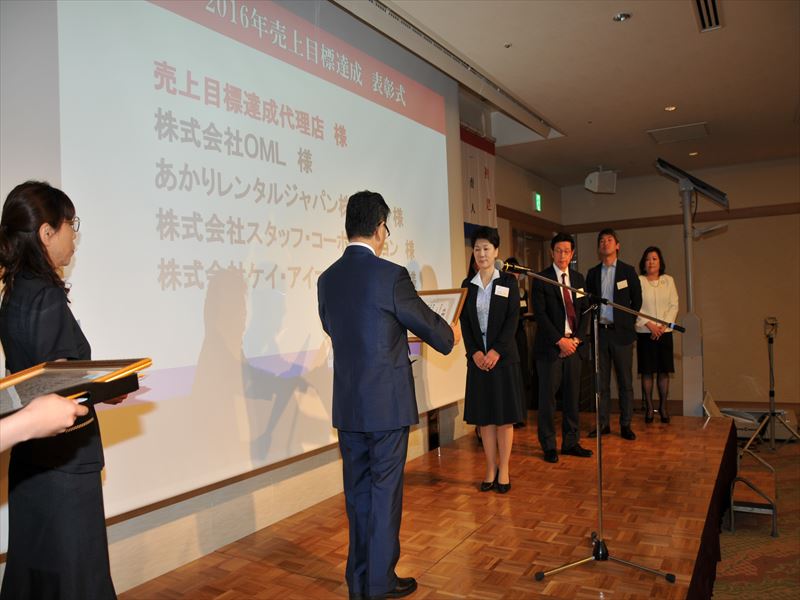 売り上げ目標達成代理店表彰では、(株)OML、あかりレンタルジャパン(株)、(株)スタッフコーポレーション、(株)ケイ・アイコーポレーションの4社が表彰されました。