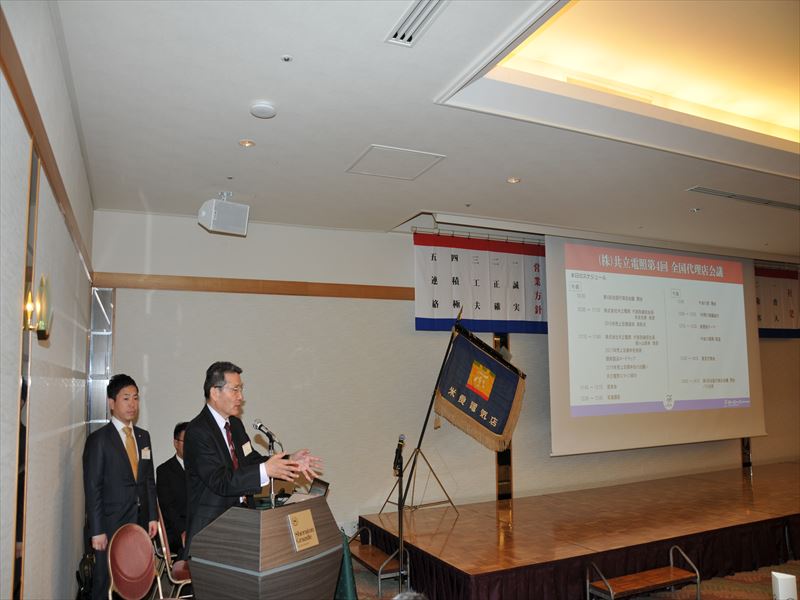 その後、弊社社長の船ケ山保幸が「この1年の間に、改良も加えた新製品が続々と完成しています。オリンピック前で、東京のみならず、全国的にスポーツ施設の整備、拡充が各自治体で展開されているなか、我々は、今までの施工実績を軸に、その分野に力を入れて事業展開をしていきたい。もちろん、高天井やトンネル灯も共立のLEDを提案してもらいたい。日々、技術向上をしながら、高品質なものを販売していくと約束いたします。今後の主力となる恵の光を中心に展開していきたい」と報告を行いました。また、この1年のさまざまな場所で納品された施工実績も紹介を行いました。