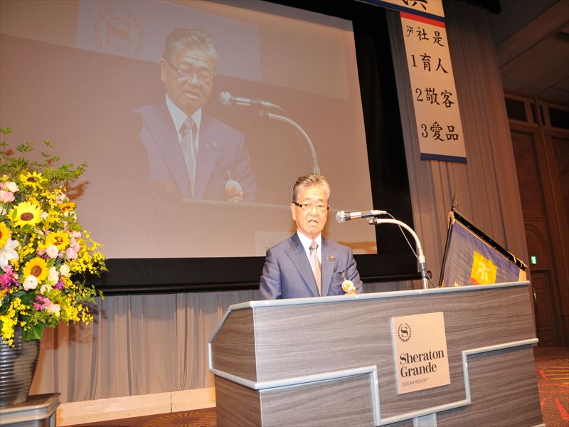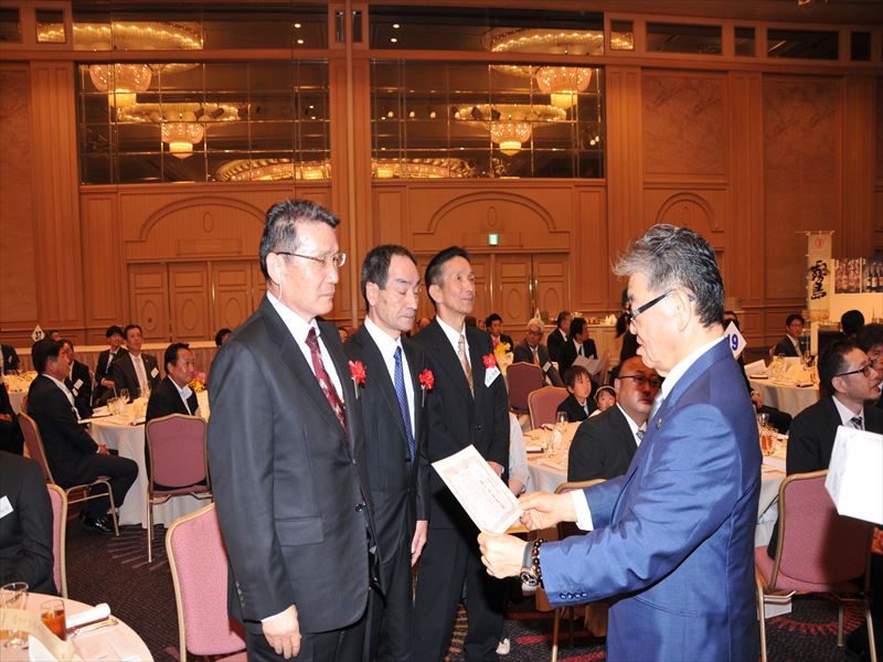 【写真は挨拶する米良社長と式典の模様。永年勤続表彰で船ケ山副社長に感謝状を手渡す米良社長。乾杯の発声をする米良常務。頑張ろう三唱のもよう。出席者全員での記念撮影】