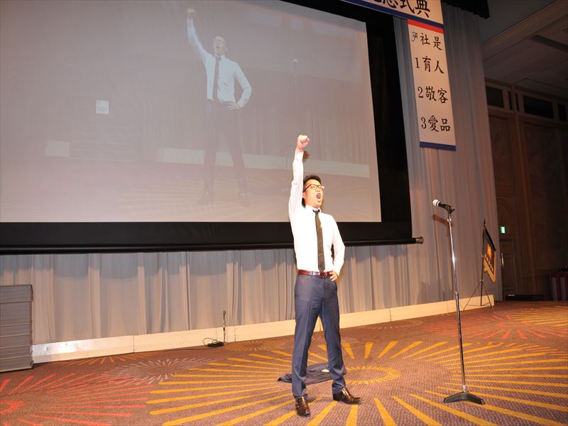 永年勤続表彰では、米良社長がひとりずつテーブルを回り記念品を贈呈。船ケ山副社長による同社の歴史紹介では、ここまでの苦労や楽しかったことやユーモアを交えながら紹介。乾杯発声では米良 充朝常務が今後の事業展開のあり方などを示唆し、力強い発声を行いました。懇親会では、ブラスバンドの演奏や社員全員から、米良会長、社長たちへ感謝状と共立図鑑が手渡されました。next100に向けて、共に立つ精神を抱き、最後に「頑張ろう」を三唱して心をひとつにし、ますますお客様のために、家族のために、社員全員まい進していく決意をいたしました