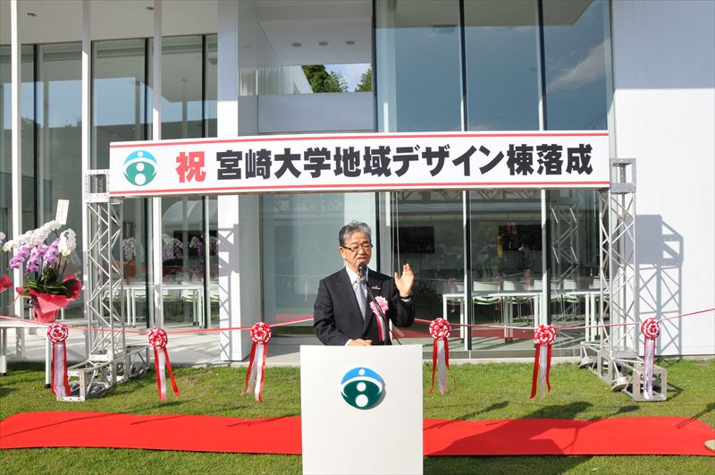 写真は竣工した地域デザイン棟と開所式、挨拶及び講演を行う米良 充典社長です。
