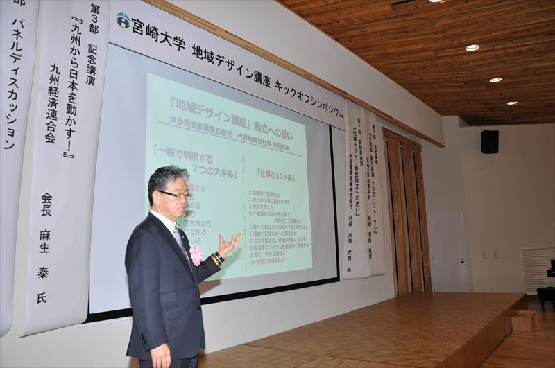 当日は、寄付者挨拶として、宮崎への郷土愛を持つ意味の重要性を踏まえ、地域デザイン講座設立の思いを熱く語りました。