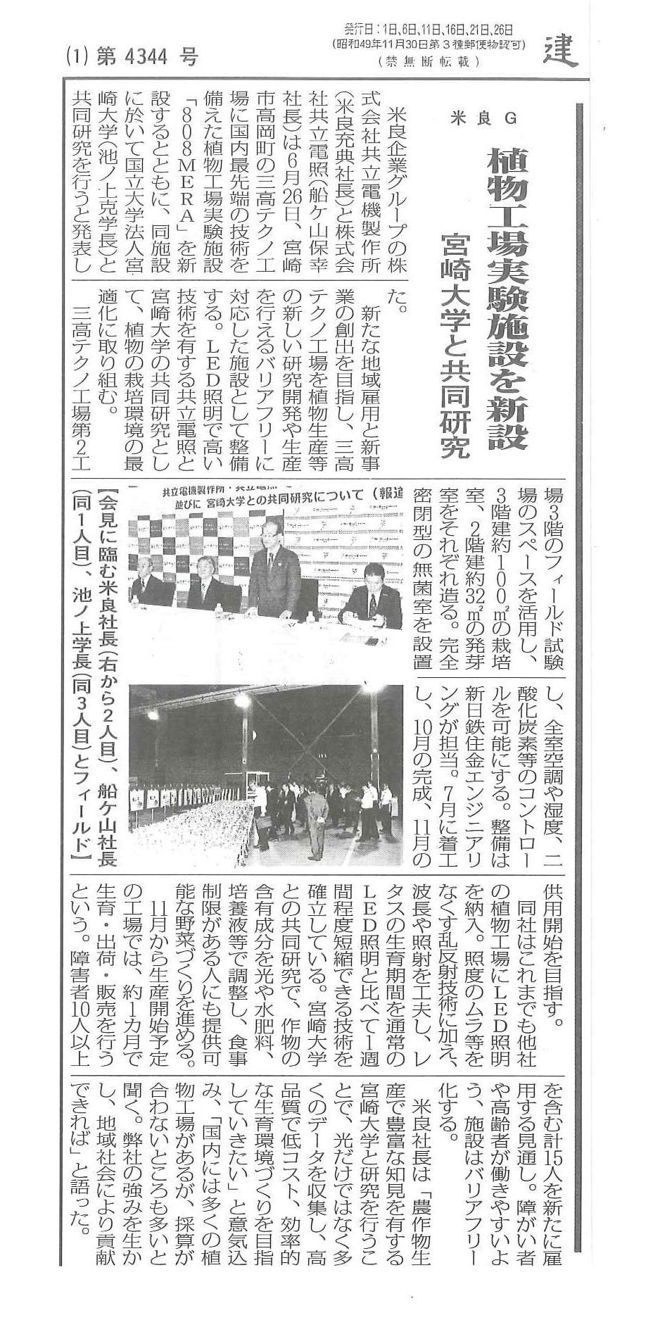 7月1日(日)付け地元の建設新聞1面に808MERAと宮崎大学との共同研究の記者会見の記事が掲載されました。