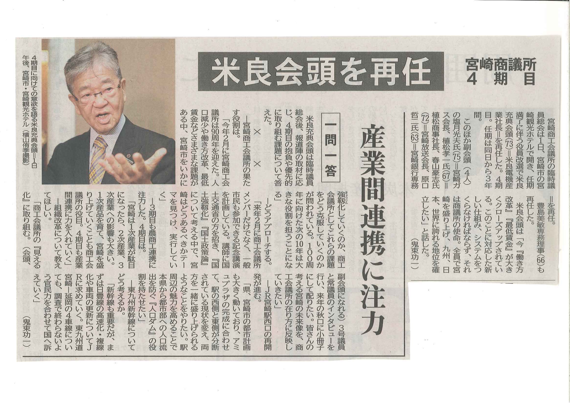 会頭再任の記事が11月2日(土)付け宮崎日日新聞9面経済欄に掲載されています。