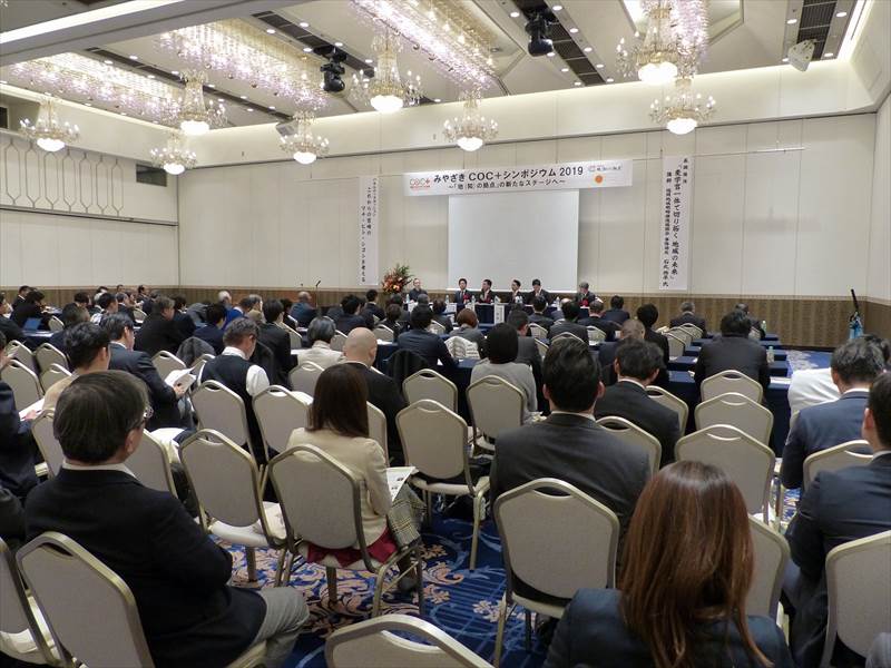 宮崎大学をはじめ本県内の各大学、宮崎県、宮崎県商工会議所連合会、JA宮崎中央会、宮崎銀行などで構成される、みやざきCOC+推進協議会は、去る12月10日、宮崎市内のニューウェルシティ宮崎に於いて、シンポジウム2019「地(知)の拠点」の新たなステージへ、をテーマに講演会を開催しました。約150名が参加しました。