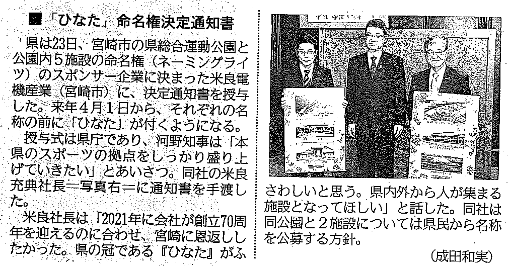 宮崎日日新聞社会欄に命名権通知書授与式の記事が掲載されました。