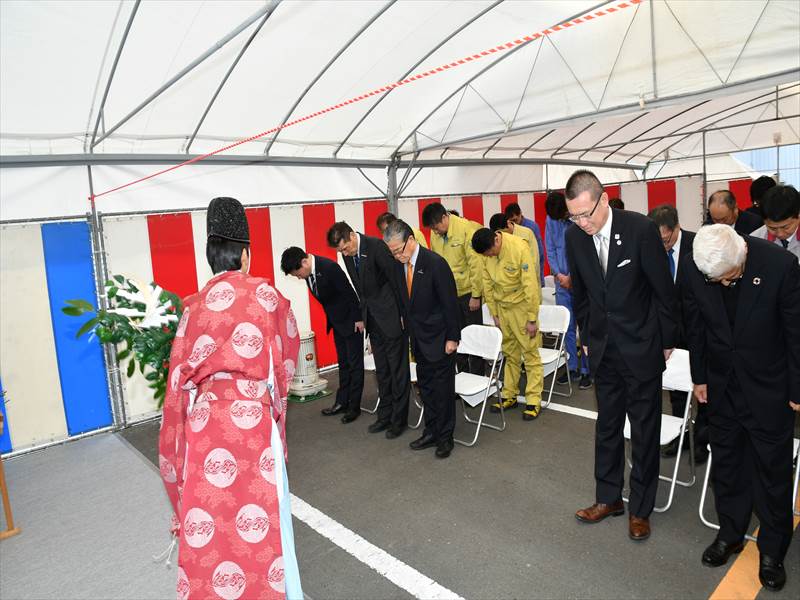 安全祈願祭では、米良 充典社長、施工者を代表して佐野 雅彦日鉄エンジニアリング(株)九州支社長ほか2名の方が玉串を奉奠していただきました。米良 充典社長は「今日、この第5期工事の起工式を迎えられて皆様に感謝しています。これにより今まで以上に生産性の効率を図り、職場環境を整えていきます」と挨拶。また、「各工事の施工担当者は安全を十二分に配慮し、事故がないように!この美しい高岡の環境を守りながら工事を進めていただきたい」と呼びかけました。