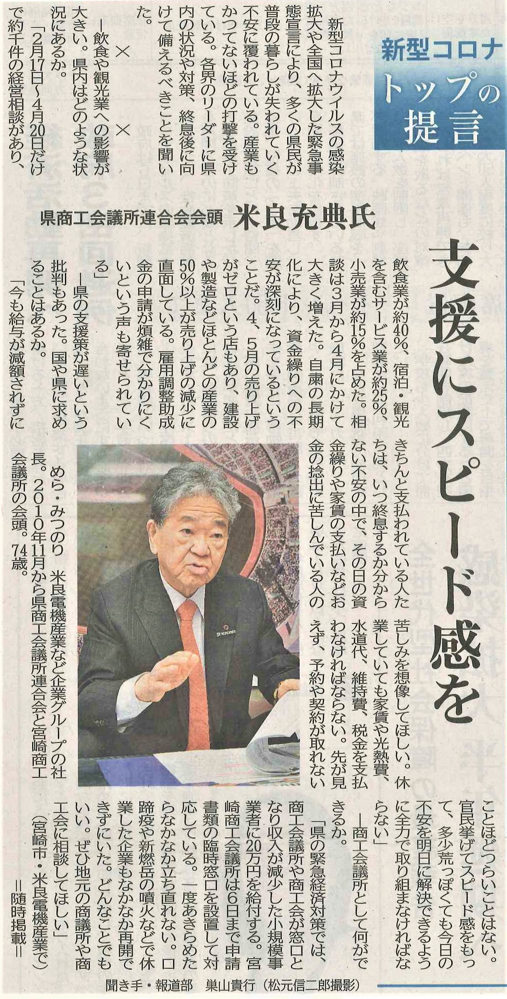 5月6日(水)付け宮崎日日新聞1面に宮崎県商工会議所連合会会頭を務める弊社社長 米良 充典の「新型コロナトップの提言」インタビュー記事が掲載されました。