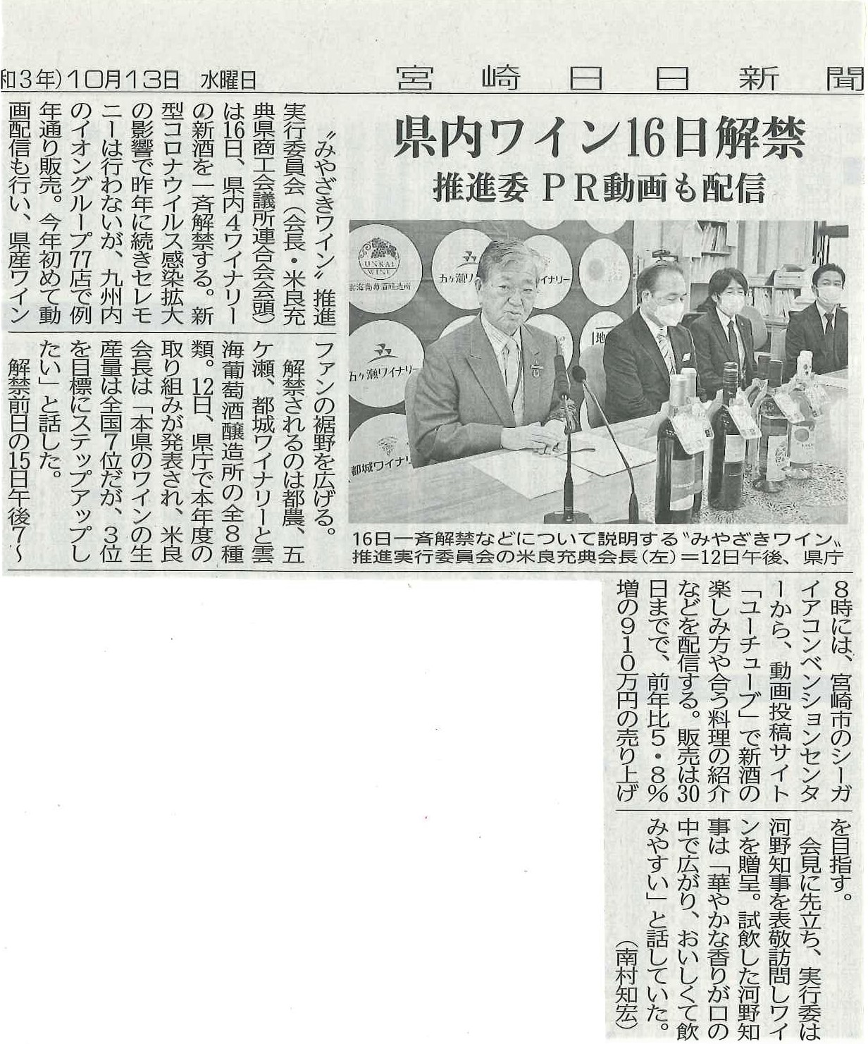 みやざきワイン推進実行委員会会長の弊社社長 米良 充典は、去る12日、県庁に於いて、今月16日から一斉解禁となる県内4ワイナリーの新酒について説明会見に臨みました。