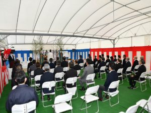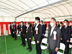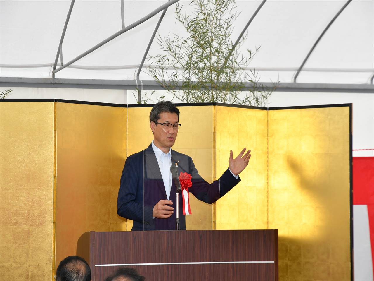 写真は安全祈願祭に参加する弊社社長米良充典と挨拶する河野宮崎県知事、建設現場のもようです。