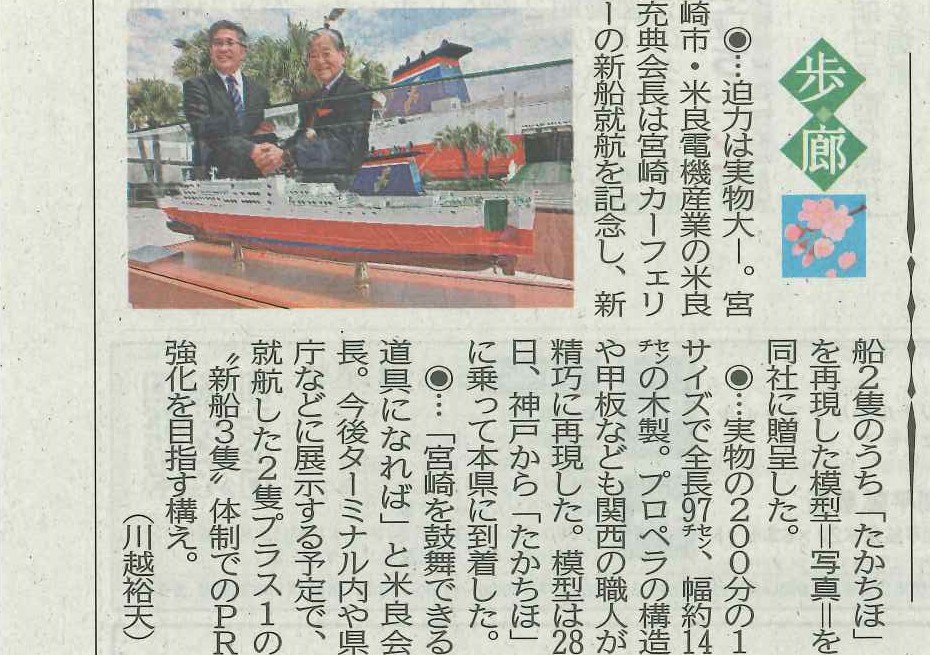 4月29日(土)付け宮崎日日新聞19面社会欄に弊社が宮崎カーフェリー様へ模型を贈呈した記事が掲載されてます。