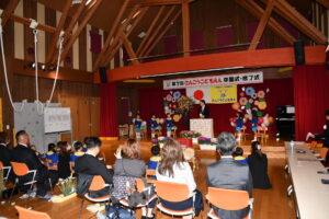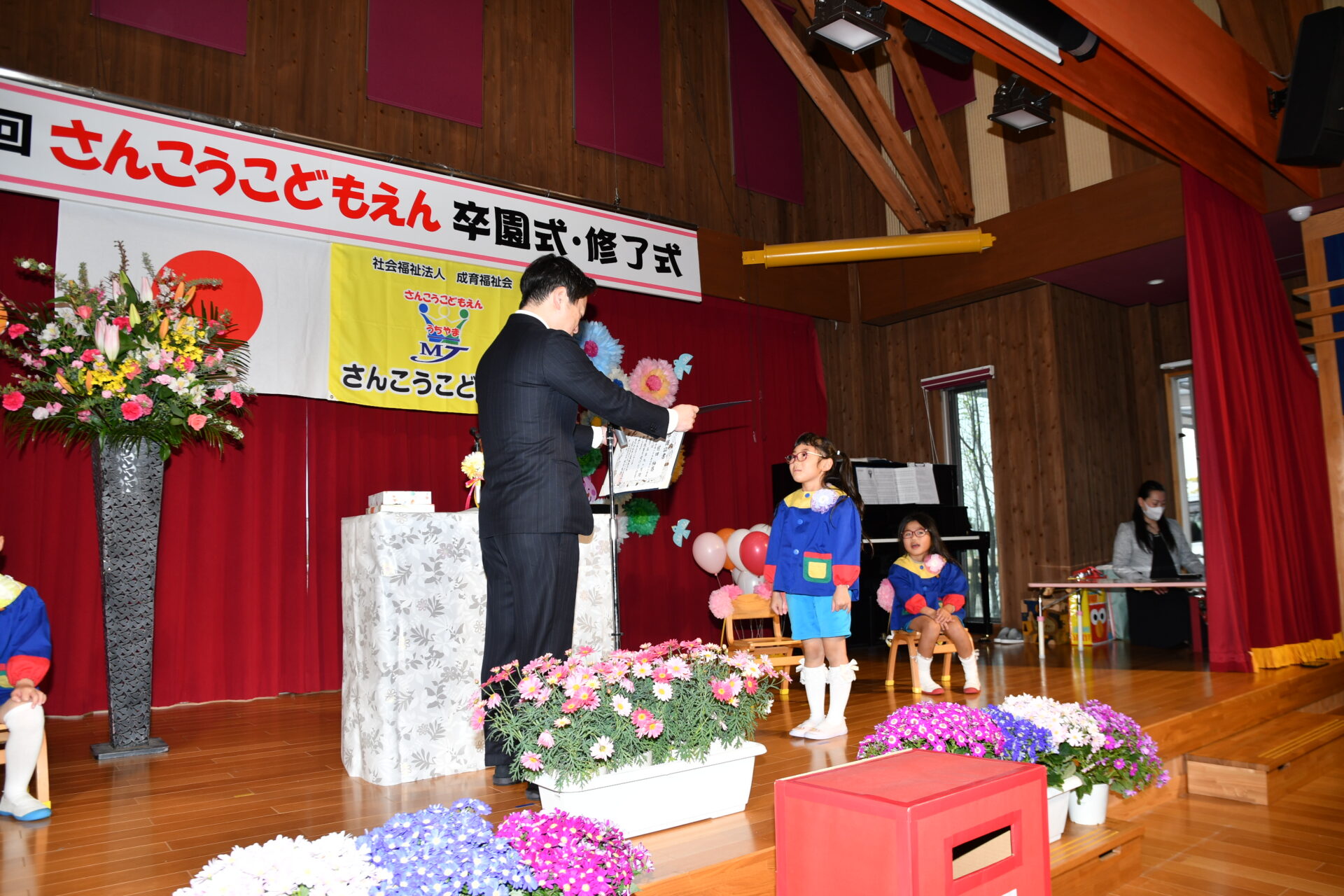 式には、卒園者のお子様をはじめ、ご父兄の皆様、こどもえんの関係者、多数の方々の出席をいただきました。明るく元気に巣立っていただければと願っています。米良充朝社長は「皆さん、しっかりと将来何になりたいのかと夢を持っています。ひとつひとつ小学校に入学した後も階段を登って行ってください。我々は皆さんに大きな期待をしています」と祝辞を述べました。