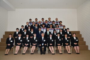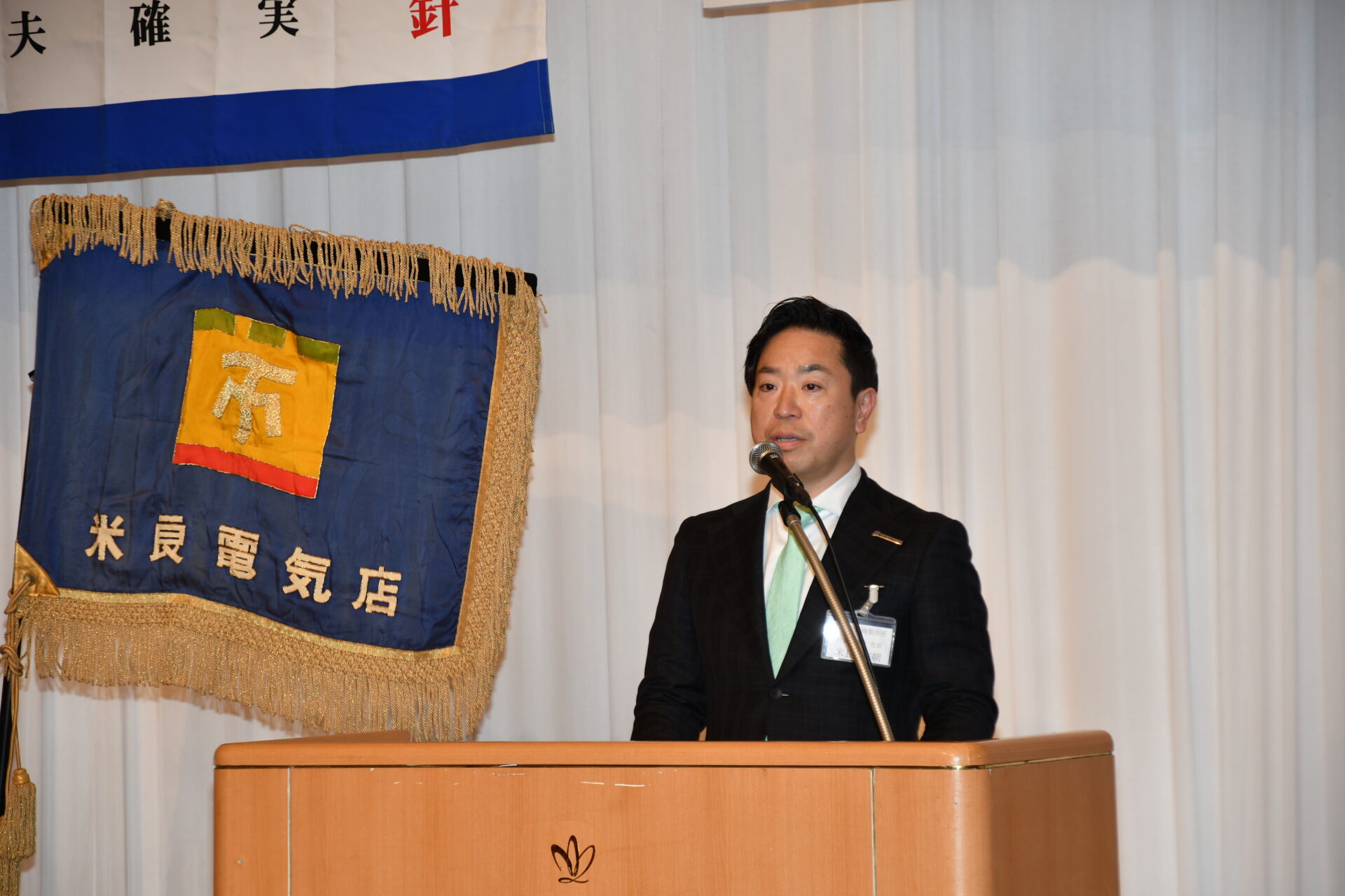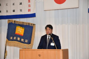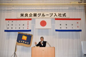 2024度も21名(米良電機産業9名、共立電機製作所、共立電照計12名)のフレッシュマンを迎えることができました。4月1日よりグループ企業各社に配属されます。 米良充典会長は「皆さんは可能性の塊です。その可能性を拡げていくのは皆さん自身だと考えます。また、我々には責任があります。今日から今までにない責任が発生します。本当の意味で親元を離れ、自立することになります。甘えをなくし、仕事をひとつずつ着実に覚えながら、健康に十分気を付け業務を進めてください。我々はあなた方の可能性に大きな期待をしています」と挨拶をしました。また、米良充由社長、米良充朝社長からも挨拶をいただきました。