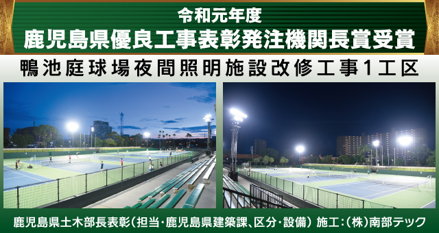 鹿児島市内の鴨池庭球場LED照明設備工事が2019年に表彰されました。照明設備は共立電照社製が採用されています。